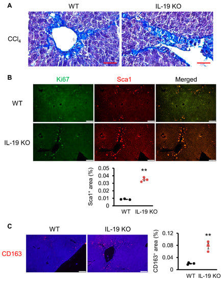 Induction of fibrosis increased proliferative cells and M2 macrophages in IL-19 KO mice. WT and IL-19 KO mice were treated with CCl4 (n = 4–6) twice a week for 8 weeks. (A) Representative liver sections stained with Masson trichrome staining are shown (n = 3). Scale bar is 50 μm. (B) Representative liver sections immunofluorescence staining with Ki67 and Sca1 antibodies are shown (n = 3). Scale bar is 100 μm. Sca1-positive area was quantified using ImageJ. Positive area was expressed as % per 0.45 mm2. ** p < 0.01 vs. WT. (C) Representative liver sections’ immunofluorescence stainings with CD163 antibody are shown (n = 3). Scale bar is 100 μm. CD-163-positive area was quantified using ImageJ. Positive area was expressed as % per 0.45 mm2. ** p < 0.01 vs. WT.