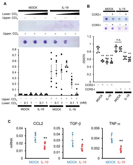 Overexpression of IL-19 on macrophages inhibits the migration of NIH3T3 cells. (A) NIH3T3 cells treated with or without CCl4 were placed in the upper cell, with the culture supernatant from MOCK or IL-19-high expressing RAW264.7 cells treated with or without CCl4 (1 mM) in the lower well, followed by incubation for 12 h (n = 5). Cells stained with circles indicate migrated cells. * p < 0.05, *** p < 0.001 vs. without CCl4. (B) NIH3T3 cells treated with CCl4 (1 mM) in the presence of CCR2 inhibitor, BMS CCR2 22 (100 nM), or CCR5 inhibitor, TAK779 (100 nM), were placed in the upper cell, with the culture supernatant from MOCK or IL-19-high expressing RAW264.7 cells treated with CCl4 in the lower well, followed by incubation for 12 h (n = 4). Cells stained with circles indicate migrated cells. ** p < 0.01 vs. without inhibitor (MOCK). (C) MOCK or IL-19-high expressing RAW264.7 cells were treated with CCl4 in the presence of IL-4 for 24 h. mRNA expressions of CCL2, TGF-β, and TNF-α in the cells were calculated by QPCR (n = 6). * p < 0.05, ** p < 0.01 vs. MOCK.