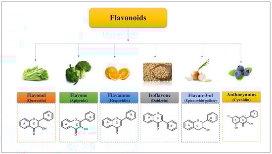 Flavonoids are primarily found in plant cells as glycosides housed in vesicles. Flavonoids consist of a C6-C3-C6 tricyclic structure in their molecular core. Flavonoids are even further categorized into subcategories based on their chemical structures [2], such as flavonols, flavones, isoflavones, anthocyanins, flavanones, and flavanols (Figure 2). Flavonoids, found in most plants, have been shown to play a crucial role in plant development, growth, flowering, fruiting, antibacterial action, and disease prevention [2]. Human health may benefit from the majority of these flavonoids due to their anti-inflammatory, antibacterial, antioxidant, and anticancer physiological actions [12].