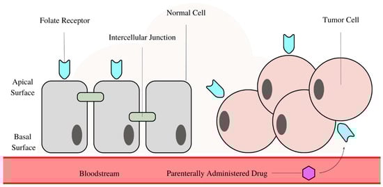One particular target gaining significant interest is the folate receptor (FR). Currently, there are four FR isoforms identified: α, β, γ, and δ in which FRα is the most investigated. It is typically expressed on the apical surfaces of normal epithelial cells in the choroid plexus, lungs, mammary duct, and kidneys. Due to its apical location away from the bloodstream, it is isolated from parenterally administered drugs. Nonetheless, the apically restricted FR is redistributed over the tumor cell surface due to the intercellular junctions collapse from carcinogenesis. Hence, the parenterally administered drugs selectively interact with FRs present in malignant tumors instead of with those from normal cells, as illustrated in Figure 1 below. Additionally, FRα is often overexpressed in tumor cells, increasing the probability of the ligand binding to the tumor instead. These two factors contribute to the selectivity of the FR targeting strategy. The tumors’ overexpression of FRs is possibly due to their increasing demand for folic acid, essential for cell maintenance and proliferation. Folic acid act as a one-carbon donor in the biosynthesis of purines and thymidylate, crucial for the de novo synthesis of RNA and DNA. Additionally, folate is essential for the cobalamin-dependent synthesis of methionine and methylation of DNA, lipids, histones, and neurotransmitters [2].