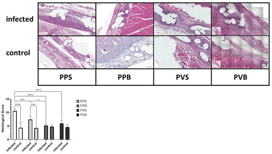 Histological score for inoculation of the different meshes with S. aureus after 7 days. Two-way ANOVA F (3,40) = 14.26, p-value < 0.0001; * = p < 0.05; *** = p < 0.001; **** = p < 0.0001.