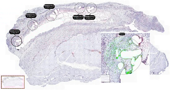 All sections were examined with the Tissue FAXS viewer (Tissuegnostics, Wien, Austria), and analysis was performed semi-automatically and in a standardized fashion using Strataquest software (Tissuegnostics, Austria). In each slide, 5 sections with an equal diameter of 1 mm were selected at the mesh–tissue interference (see Figure 4). Percentages of positively stained cells were assessed, as visualized in Figure 5. For immunohistochemistry, only infected meshes were examined, and PP mesh in standard structure served as control group.