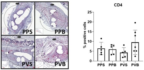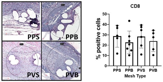 CD4+ T helper cells were significantly more abundant at 7 days (F(3,22) = 4.82, p-value = 0.01), but not 21 days after the mesh implantation (F(3,17) = 1.65, p-value = 0.214). PV-B meshes showed a significantly higher CD4+ T cell count at 7 days than PP-B and PV-S meshes (p-values 0.015 and 0.03, respectively). For examples of our immunohistochemical staining results, see Figure 10 and Figure 11.