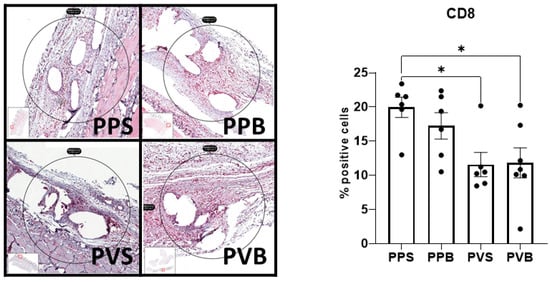 Evaluation of CD8 in the different meshes after 21 days, One-way ANOVA F(3,21) = 4.68, p-value = 0.012; * = p < 0.05.