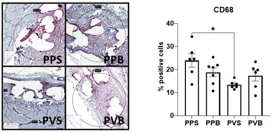 The number of CD68+ macrophages was significantly different at 21 days (F(3,21) = 4.14, p-value = 0.019) but not 7 days after mesh implantation (F(3,22) = 0.07, p-value 0.97). PV-S meshes at 21 days showed a significantly lower expression of CD68 than standard PP-S meshes (p = 0.011). For representative example images please refer to Figure 8 and Figure 9.