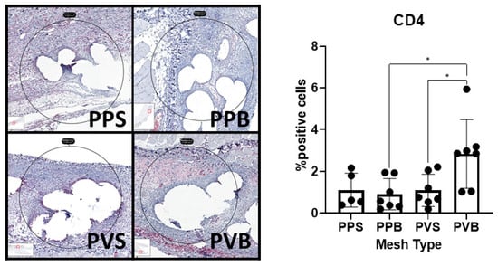 Evaluation of CD4 in the different meshes after 7 days. One-way ANOVA F(3,22) = 4.82, p-value = 0.01. * = p < 0.05.