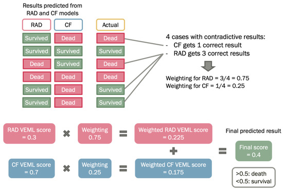 Predictive weighting is an important factor that reflects the model’s probability of acquiring a correct prediction under a conflicting situation. When the radiomics model and the clinical factor model have different predictions of the patient outcome, the occurrences of a correct prediction by each model are counted according to the probability of getting a correct prediction by each model.