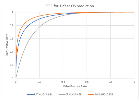 The best performance was achieved by the PWE model for the one-year survival prediction with an AUC of 0.955 (95% CI [0.9264,0.9742]); with the RAT model for the five-year survival prediction with an AUC of 0.942 (95% CI [0.8923–0.9714]) and the CF model had the lowest AUC of 0.846 (95% CI [0.7697–0.9027]) for the five-year survival prediction (Table 4).