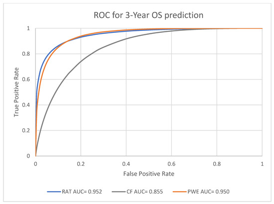 Prediction of 3-year survival using RAT, CF, and PWE models.