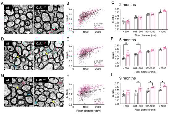 Previous studies have shown that an increase in the G-ratio of callosal axons indicative of demyelination followed by remyelination is evident as early as 11 months of age in Csf1r+/− mice [17]. To determine the time course of this demyelination, we examined cross-sections of corpora callosa obtained from Csf1r+/− and control wt mice at 2-, 5- and 9 months of age by transmission electron microscopy. Callosal fiber cross-sections were used to calculate axonal G-ratios, the ratio of the inner to the outer diameter of a fiber. An increase in the G-ratio in the axons of Csf1r+/− mice compared with wt mice was first noticeable by 5 months of age (Figure 1A,D,G). As shown in the scatter (Figure 1B,E,H) and bar (Figure 1C,F,I) plots, significantly increased G-ratios were first evident in the small (<900 nm diameter) fibers in 5-month-old mice (Figure 1E,F), while the higher diameter fibers did not show significant changes until 9 months of age (Figure 1H,I). As behavioral deficits in Csf1r+/− mice are first detected at 7 months of age, callosal demyelination is the earliest indicator of disease.