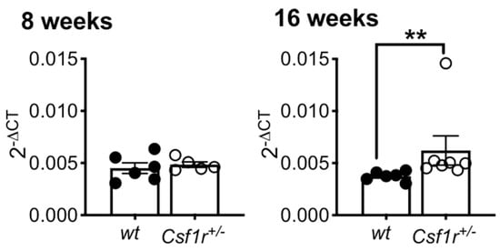 We have previously shown that TREM2 expression is elevated in the microglia of 20-month-old Csf1r+/− mice and the brains of CRL patients [18]. Given the evidence of demyelination at 5 months of age and the importance of microglial TREM2 in promoting the clearance of apoptotic neurons and myelin debris, we compared the expression of Trem2 mRNA in young Csf1r+/− and control wt mice at 2 and 4 months of age (Figure 2). By 2 months of age, in the absence of detectable callosal demyelination, there was no difference in Trem2 expression between Csf1r+/− and wt mice. However, by 4 months of age, Trem2 expression was significantly increased (Figure 2).