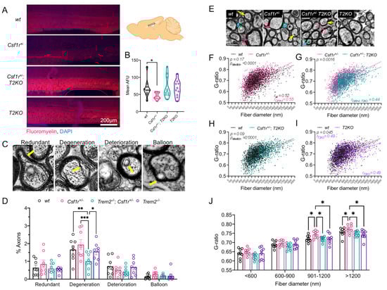 To investigate the role of Trem2 in the callosal demyelination in Csf1r+/− mice, we developed a cohort comprised of the following genotypes: Csf1r+/+; Trem2+/+ (wt), Csf1r+/−; Trem2+/+(Csf1r+/−), Csf1r+/−; Trem2−/−; (Csf1r+/−; T2KO) and Trem2−/−; Csf1r+/+ (T2KO). Mice were euthanized at 9 months of age and myelination was examined histologically and ultrastructurally. We observed decreased fluoromyelin staining in the corpus callosum of the Csf1r+/− mice that was prevented by Trem2 deletion (Figure 3A,B). Similar data were obtained with MPB staining (Supplementary Figure S1). Analysis of the myelin pathology indicated that at this age there were no significant increases in the myelin redundancy, degeneration, deterioration or balloon formation in Csf1r+/− compared with wt mice (Figure 3C,D). However, Trem2 deletion in Csf1r+/− mice significantly reduced the myelin degeneration (Figure 3D). Consistent with this, ultrastructural examination of cross-sections (Figure 3E–I) showed that all Csf1r+/− fibers tended to have higher G-ratios than wild-type fibers, with a significant elevation in medium-sized fibers (901–2000 nm diameter, Figure 3J). Loss of Trem2 had a beneficial effect, decreasing the G-ratio observed in two of the four Csf1r+/− fiber size classes (Figure 3F–J). These results suggest that the upregulation of Trem2 contributes to callosal demyelination in Csf1r+/− mice.
