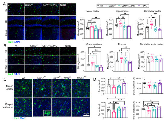 3.5. Trem2 Ablation Prevents the Increase in Microglial Density and Alterations in Their Morphology in Csf1r+/− Mice