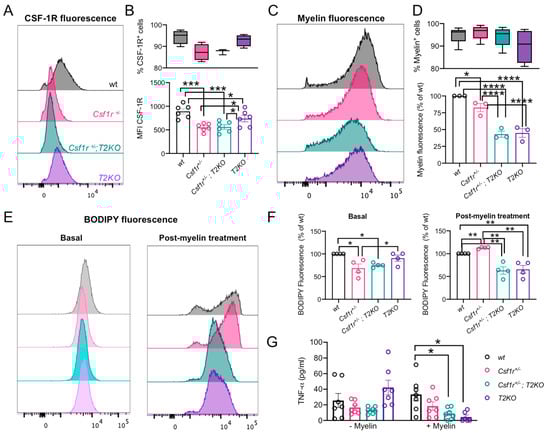 Previous studies indicate that myelin can act as an endogenous inflammatory stimulus for macrophages triggering the production of inflammatory cytokines such as TNF-α [42]. Furthermore, the accumulation of lipid droplets in microglia has been reported to create a dysfunctional state and exacerbate the production of inflammatory cytokines [43]. We therefore explored how Csf1r and Trem2 deficiency affect the production of TNF-α. Macrophages were incubated in the presence or absence of myelin for 24h. While the production of TNF-α by Csf1r+/− macrophages was comparable to wt in both conditions, Trem2 deficiency suppressed the production of TNF-α in the presence of myelin debris (Figure 6G).