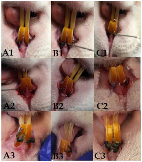 Columns (A1–A3) represent the 108 group, with clinical aspect at the time of application of the first ligature (A1), after 14 days of contamination (A2), and on day 28 (A3). Columns (B1–B3) represent the 109 group, with clinical aspect at the time of application of the first ligature (B1), after 14 days of contamination (B2), and on day 28 (B3). Columns (C1–C3) represent the 1010 group, with clinical aspect at the time of application of the first ligature (C1), after 14 days of contamination (C2), and on day 28 (C3).