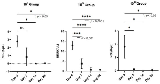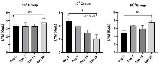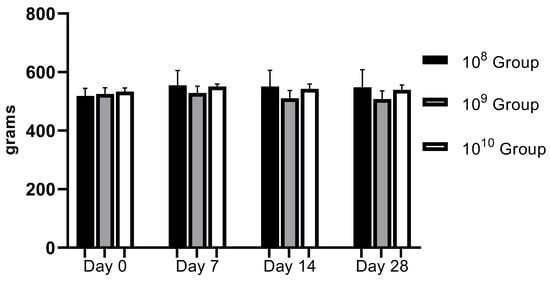 Analyses were performed using Prism 9 software for Windows (GraphPad LLC, Chicago, IL, USA). To compare the data, the one-way ANOVA function was used, and a value of p < 0.05 was considered statistically significant. Regarding the analysis of the data obtained after the hematological examination, we compared the results obtained from each group (108, 109, and 1010), comparing them with day 0 using the one-way ANOVA function and multiple comparisons and comparing the data from days 7, 24, and 28 with those from day 0 using Dunnet’s test.