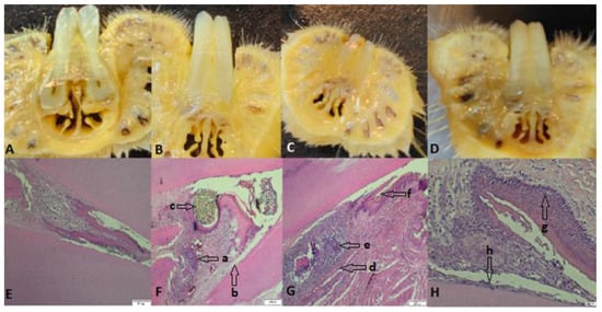 (A–D) Images with cross sections through the collected part; (E) the part collected from a control rat, uncontaminated and without ligature, showing intact alveolar bone and continuous cementum; (F) the part from a rat from group 108, which presents hypertrophy, granulation tissue (a) with nucleated cells that peel off, abundant neutrophils, coccobacilli, inflammation, hyperemia, hyperplasia of the gingival epithelium, and periodontal lysis (b), with a ligature thread present (c); (G) rat teeth from group 109 (granuloma) (d), alveolar bone lysis, pulp tissue with necrotic bone fragments surrounded by pyogranulomatous inflammation, neutrophilic infiltrate (e), abundant granulation tissue, bacteria (coccobacilli), and fodder in the space periodontally invaded with bacteria (f); (H) teeth of rats from group 1010 with hyperplasia (g), an intact alveolodental ligament, abundant granulation tissue, fewer inflammatory cells, bacteria in the alveolar sac, and anucleated desquamation cells on the alveolodental ligament area (h). Sections were stained with H&E. Original magnification: 4×; scale bars = 200 μm.