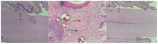 (A) Detail of a rat tooth from group 108 with a partially desquamated alveolodental ligament (a); (B) strong reaction of hyperemia (b1) and neutrophilic infiltrates (b2) in a rat from group 109; (C) overview highlighting the periodontal sac (c) of a rat from group 1010.