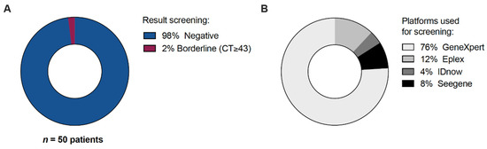 All heart transplant recipients that underwent pre-operative SARS-CoV-2 testing. N = 50. (A) Screening result. (B) Platforms used for screening.