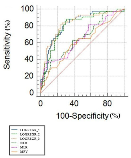 The specificity and sensitivity of NLR, PLR, MLR, and SII in predicting DR and PDR were analyzed by ROC curves. A minimum value of 0.6 area under the curve (AUC) was considered as a criterion for an acceptable discrimination model [30]. Logistic regression analysis was used to study correlations between several biological parameters and DR. The best regression models were compared by an ROC AUC (area under the curve) score in terms of efficiency of prediction.