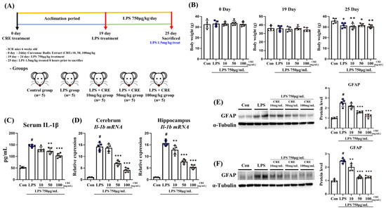 CRE reduces the neuroinflammatory state induced by lipopolysaccharide. (A) The experiment outlines the timetable of the animal experiments. The mice were treated with CRE extract orally for 25 d, and the control group was administered distilled water of the same volume as the CRE extract. lipopolysaccharide treatment was given on day 19 at 750 μg/kg/body weight for a week. The mice were sacrificed before 8 h lipopolysaccharide treatment at 1.5 mg/kg body weight, and their organs were collected. (B) The changes in mouse body weight on days 0, 19, and 25. The statistical analysis was performed using one-way analysis of variance (ANOVA) and Tukey post hoc analysis. The results are presented as means ± SD, with * p < 0.05 and ** p < 0.01 indicating significance compared to the lipopolysaccharide group. (C) Serum IL-1β levels were measured, with the lipopolysaccharide group showing a significant increase compared to the control group and the lipopolysaccharide + CRE 50 mg/kg and lipopolysaccharide + CRE 100 mg/kg groups showing a significant decrease compared to the lipopolysaccharide group. (D) Il-1b mRNA levels were measured in the cerebrum and hippocampus of each group of male mice. (E) GFAP were evaluated in the cerebrum of each group of male mice by Western blot analysis. α-Tubulin was used as an internal control. (F) GFAP were evaluated in the hippocampus of each group of male mice. α-Tubulin was used for internal control. The statistical analysis was performed using one-way ANOVA and Tukey post hoc analysis. The values represent means ± SD # p < 0.001 indicating significance compared to the control group and ** p < 0.01, *** p < 0.001 indicating significance compared to the lipopolysaccharide group.
