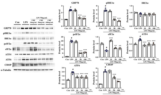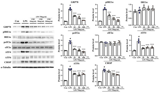 Previous results have shown that lipopolysaccharide induces IL-1β. Additionally, CRE reduced the use of the secretion of IL-1β. It can promote the activation of UPR and ER stress responses, resulting in a vicious cycle of inflammation and ER stress [43]. We investigated whether ER stress increased during neuroinflammation or whether CRE decreased ER stress.