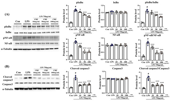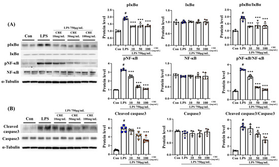 CRE decreases the NF-κB pathway and apoptosis-related protein levels in the cerebrum. (A) The levels of NF-κB pathway-related genes in the cerebrum of male mice from each group were analyzed using Western blot and quantification methods, with alpha-tubulin as the internal control. (B) The levels of apoptosis-related genes in the cerebrum of male mice from each group were analyzed using Western blot and quantification methods, with Alpha-Tubulin as the internal control. The statistical analysis was performed using one-way ANOVA and Tukey post hoc analysis. The values represent means ± SD # p < 0.001 indicating significance compared to the control group and * p < 0.05, *** p < 0.001 indicating significance compared to the lipopolysaccharide group.
