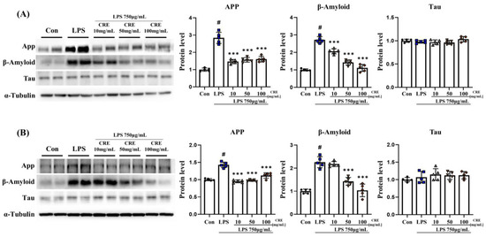 CRE reduces Alzheimer’s disease-related markers in mouse brains. (A) The levels of Alzheimer’s disease-related features in the cerebrum of male mice from each group were analyzed using Western blot and quantification methods, with Alpha-Tubulin as the internal control. (B) The levels of Alzheimer’s disease-related markers in the hippocampus of male mice from each group were analyzed using Western blot and quantification methods, with Alpha-Tubulin as the internal control. The statistical analysis was performed using one-way ANOVA and Tukey post hoc analysis. The values represent means ± SD # p < 0.001 indicating significance compared to the control group and *** p < 0.001 indicating significance compared to the lipopolysaccharide group.