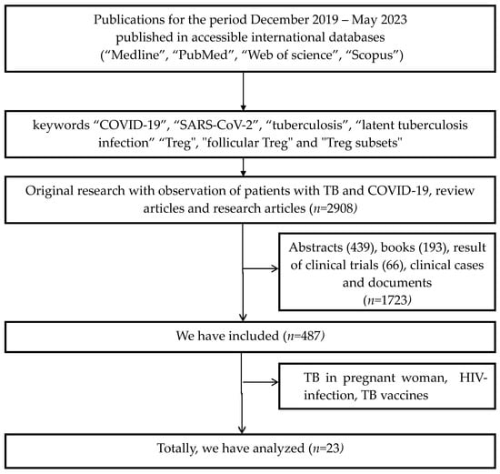 We analyzed publications, released from December 2019 to May 2023 after searching for works published in accessible international databases (“Medline”, “PubMed”, “Web of Science”, “Scopus”) with search parameters for keywords such as “COVID-19”, “SARS-CoV-2”, “tuberculosis”, “latent tuberculosis infection”, “pulmonary tuberculosis”, “autoimmune inflammation”, “Treg”, “follicular Treg”, and “Treg subsets”. Inclusion criteria were: Original studies with TB patients and COVID-19, reviews, and research articles. Exclusion criteria were: Clinical cases, abstracts, clinical trials, books, TB in pregnant women, HIV-infection, and TB vaccines. We analyzed 2908 publications excluding abstracts (439), books (193), results of clinical trials (66), and clinical cases and documents (n = 1723). We included 487 publications, analyzing a total of 23 publications (Figure 1).