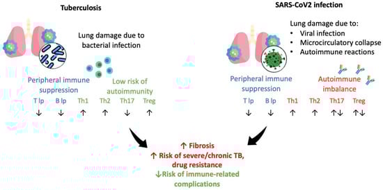 The presented data characterize the immune response mounted by Mycobacterium tuberculosis prior to the emergence of SARS-CoV-2 in global medical practice. Clearly, exposure to a single causative agent, resulting in a very specific bacterial infection, accompanied by an immunosuppressive response, along with autoimmune inflammation. It may aggravate immunocompromised condition after infection with a viral agent. The occurrence of such disorders can simultaneously alter the course of TB infection similar to co-infection with HIV []. The goal of our study in the context of the limited number of available studies and currently accumulated experience was to identify potential alterations, while comparing the data published on tuberculosis and COVID-19 co-infection.