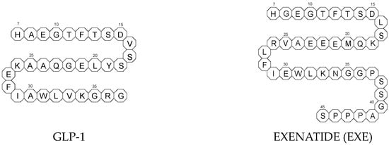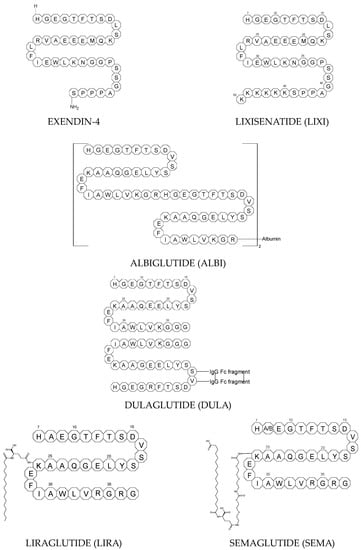 All glutides present on the market are synthetic peptides with high homology with human GLP-1 (7–37). EXE, which is given to patients subcutaneously twice daily, was the first GLP-1 RA introduced into therapy in 2005 (FDA approval). It is a 39-amino acid synthetic peptide with 53% homology with human GLP-1 (7–37). It contains an Ala8Gly substitution that increases its resistance to degradation by DPP-4. In addition, EXE in the form of a sustained-release formulation that could be given subcutaneously once a week is also available on the market. It consists of an EXE moiety embedded within biodegradable polymeric microspheres of poly(DL-lactic-co-glycolic acid) [].