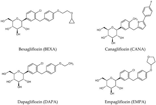 By targeting the kidney, gliflozins have a unique mechanism of action that results in enhanced glucosuria, osmotic diuresis, and natriuresis. Thereby, they improve glucose control with a limited risk of hypoglycemia. In addition, they have shown favorable effects on cardiovascular risk factors such as body weight, blood pressure, lipid profile, arterial stiffness, and endothelial functions [,]. The predominant pathophysiological mechanisms that may explain the cardiovascular benefits of SGLT2 include plasma volume and diuresis, cardiac fibrosis, myocardial metabolism, and adipokine kinetics. Therefore, the current guidelines propose a new procedure in the management of T2DM with a preferential place for SGLT2, even before metformin, especially in patients with atherosclerotic cardiovascular disease, heart failure, and progressive kidney disease []. As far as the gliflozin presence on the pharmaceutical market is concerned, DAPA was approved by EMA in 2012 and by FDA in 2014; CANA by both EMA and FDA in 2013; and EMPA in 2014. LUSE, IPRA, and TOFO were approved in Japan in 2014. ERTU was approved by the FDA in 2017 and by the EMA in 2018, and BEXA by the FDA in 2023. The structures of the mentioned gliflozins are presented in Figure 2.