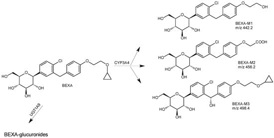 Based on the results obtained by the Authors, BEXA was shown to be metabolized via glucuronidation and oxidation to form six principal metabolites, i.e., three non-active metabolites through glucuronidation and three through oxidation, i.e., BEXA-M1, BEXA-M2, and BEXA-M3 (Figure 3). In vitro studies identified CYP3A4 and UDP-glucuronosyltransferase UGT1A9 as the major enzymes acting on the BEXA moiety. Following oral dosing of humans with [14C]-BEXA, the 3-O-glucuronide contributed 32% of the parent drug, and all other metabolites contributed < 10%. The input of recovered radioactivity was ca. 90%, and of this, ca. 50% was present in feces, predominantly as BEXA, and ca. 40% was present in urine, mainly as 3-O-glucuronide. At the same time, BEXA-M2 was shown as a major metabolite in vivo in all species examined. The pharmacological activity of these metabolites was assessed by measuring the sodium-dependent uptake of the particular substrate, methyl-a-D-[U-14C]-glucopyranoside, that was not metabolized, by cells expressing recombinant human SGLT2 protein. All metabolites had less than 10% of the activity of the parent BEXA [].