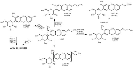 In the study of Miyata et al. [], the primary metabolic pathways of luseogliflozin (LUSE) and the enzymes responsible for these transformations were investigated in humans. It was shown that, in plasma, the unchanged parent LUSE gave the most abundant peak. However, over 10 minor metabolites were observed. The primary metabolic pathways involved O-demethylation of the unchanged drug followed by hydroxylation of the 5-benzyl-4-methylphenylmoiety to form LUSE-M1, O-deethylation to form LUSE-M2, and subsequent glucuronidation; ω-hydroxylation at the ethoxy group to form LUSE-M3 followed by oxidation to form the corresponding carboxylic acid metabolite LUSE-M4, as well as direct glucuronidation. Further studies indicated that the formation of LUSE-M2 was mainly mediated by CYP3A4/5, and subsequently, glucuronidation was catalyzed by UGT1A1, UGT1A8, and UGT1A9. The formation of LUSE-M3 was mediated by CYP4A11, CYP4F2, and CYP4F3B, while further oxidation of LUSE-M3 to LUSE-M5 was mediated by alcohol dehydrogenase and aldehyde dehydrogenase. These results demonstrated that LUSE is metabolized through multiple pathways, including CYP-mediated oxidation and UGT-mediated glucuronidation (Figure 7) [].