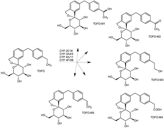 Furthermore, the more or less important metabolic pathway of SGLT2 inhibitors via oxidative reactions occurred, e.g., for BEXA, DAPA, ERTU, LUSE, and TOFO. Such metabolic pathways, e.g., ω-hydroxylation at the ethoxy group followed by oxidation to form the corresponding carboxylic acid, were shown for LUSE, leading to the formation of LUSE-M4. The metabolic pathway via oxidation of the substituents at the 4-phenyl position of BEXA, DAPA, ERTU, LUSE, and TOFO seems to also be the characteristic pattern of their metabolism. The hydroxyl metabolite TOFO-M1 undergoes further oxidation to the respective ketone metabolite TOFO-M2. The next hydroxyl metabolite, TOFO-M3, is further oxidized to the corresponding phenyl acetic acid metabolite, TOFO-M4 (Figure 15). Furthermore, the process of hydroxylation of the benzyl-phenyl or benzyl-thiophen moieties is characteristic for BEXA, CANA, DAPA i ERTU (Figure 16).