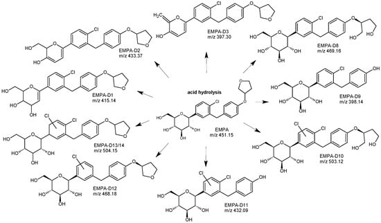 Degradation pathways of empagliflozin (EMPA) in acidic conditions; for EMPA-D8-EMPA-D14 m/z [M+NH4]+ [,,].