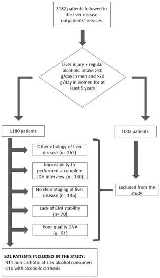 A total of 2182 consecutive Caucasian patients followed in the liver disease outpatient services of the Translational and Precision Medicine, Policlinico Umberto I, Rome, Italy, between 2010 and 2021 were retrospectively analyzed. On the first visit, all patients underwent a detailed clinical examination and interview on their clinical history and lifestyle habits. At-risk alcohol consumption, defined as ≥3 and ≥2 alcohol units per day for men and women, respectively, for at least 5 years, was present in 1180 patients. One unit of alcohol was defined as 12 g of ethanol. In patients with at-risk alcohol use, a more thorough alcohol history was obtained by interview, performed by specialist experts in alcohol history, using the lifetime drinking history (LDH). In particular, the age reported at the beginning of at-risk alcohol consumption, the duration in years of at-risk alcohol consumption, and the average daily intake of alcohol, expressed as the number of alcoholic units per day, were obtained. The eventual presence of cirrhosis and the time of first diagnosis of cirrhosis were also reported, as previously described [23]. Body mass index (BMI) calculation based on dry weight was recorded. Patients were asked whether their body weight was stable (changes < 5 kg) compared to that at age 25 at the first visit for noncirrhotic patients and before the diagnosis of cirrhosis in cirrhotic patients. Subjects with a history of unstable BMI, a present or previous concurrent diagnosis of hepatitis B and/or C, autoimmune hepatitis, primary biliary cholangitis, primary sclerosing cholangitis, Wilson’s disease, and hemochromatosis were excluded from the study. We also excluded from the analyses subjects with incomplete LDH data, clinical/biochemical data that were too incomplete to obtain a diagnosis of cirrhosis and/or a definite age at diagnosis of cirrhosis, or with poor DNA quality. A total of 521 patients were included in the study, as described in the flowchart (Figure 1).