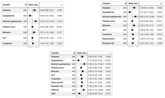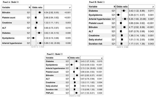 Multivariable logistic regression analysis for the entire study population. Panel A represents Model 0, panel B represents Model 1, and panel C represents Model 2. In panels (A–C), the models were defined by taking into consideration the values of platelet count (odds ratio expressed by counts × 103/µL divided by 10), creatinine (odds ratio expressed by mg/dL multiplied by 10), and ALT (odds ratio expressed by U/L divided by 10). In panels (B,C), the models were defined by taking into account the daily alcohol consumption (odds ratio expressed by the units of daily alcohol consumption divided by 10) and the duration of at-risk alcohol consumption (odds ratio expressed by the years of at-risk alcohol use divided by 5).