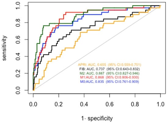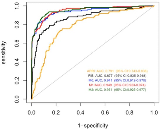To test the accuracy of cirrhosis diagnosis of our models, we compared them with that of FIB4 and APRI in the entire study population (Figure 3). As described in Table 2, all the proposed models obtained significantly better results than FIB4 and APRI. In particular, the AUROCs were 0.791 for APRI, 0.877 for FIB-4, 0.941 for Model 0, 0.949 for Model 1, and 0.951 for Model 2.
