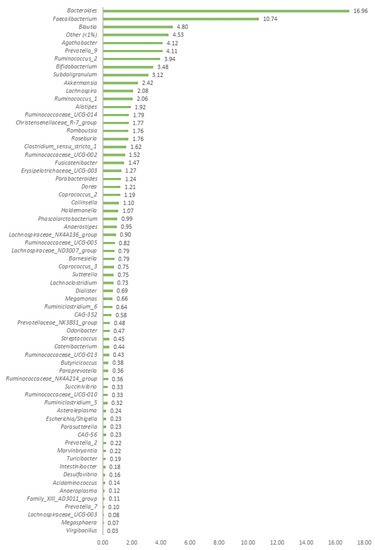 Most relevant taxa (frequency >1% in at least one sample) found in the human faecal samples of the 39 volunteers. The group “others” included the summation of the rest of the bacterial taxa with a frequency of occurrence <1.0%. Only two genera (Bacterioides and Faecalibacterium) exhibited frequencies above 10%, while the remaining taxa were widely distributed.
