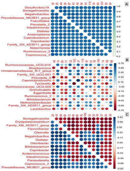 Regarding age (Figure 2B), the strength of log-ratio linkage with the bacterial population, measured using Spearman correlation due to the glm model used to predict age, was not robust. The relationship rarely reached a Spearman correlation (the adequate parameter for numeric variables association) above 0.75. Notably, some of the most relevant correlations were observed between the log-ratios of Ruminococaceae_UCG-010 vs. Streptococcus, Prevotella _9K, etc., with correlation values around 0.75 for some instances. However, compared to sex, the association with age appears to be less intense. The most important variables were Ruminococcaceae_UCG-010, Streptococcus, Christensenellaceae_R-7_group, Familly: XIII_UCG-001, and so on (Figure 2B). Additionally, the log-ratio Tizzerella_4/Caproicidiproducents remained strongly associated with age, as seen previously. The following order in the Pearson correlation was for the log-ratio of Streptococcus vs. most of the other taxa below it. However, the overall relationships were notably weaker, as demonstrated by numerous cells coloured with lighter tones (Figure 2B). Notice that, for numeric variables, the correlation can go from 1 (intense blue) when age and taxa follow similar trends to −1 (red) when the age and ASV follow opposed directions (negative correlation).