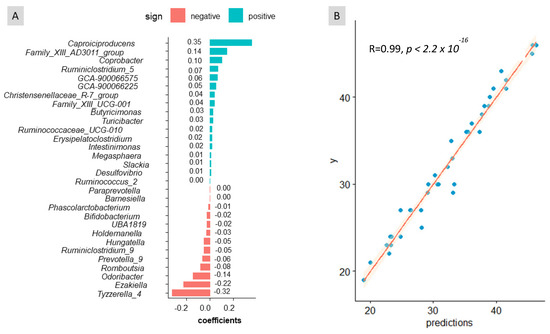 Considering the important role played by sex in the gut microbiota, predictions of age and weight were performed using sex as a co-variable. The balance signature inferred for age (Figure 4A) included numerous bacterial taxa, most of which had low relevance. Noteworthy contributors to this balance were Caproiciproducens, Family_XIII_AD3011_group in the numerator and Odoribacter, Ezakiella, and Tyzzerella_4 in the denominator. Overall, this balance signature differed considerably from the one selected for sex. This analysis showed a good agreement between the observed and predicted values (Figure 4B), with an R-square of 0.989. This study’s findings reveal that age influences the composition of faecal microbiota. Although estimating age solely from the faeces microbiome is unlikely, it was interesting to demonstrate its potential when accounting for the effects of sex and weight. Furthermore, the results obtained when using sex and weight as co-variables were similar to those obtained when considering sex alone. This provides additional evidence for the limited influence of weight (within limits used in the experiment) on the composition of the faecal bacteria.