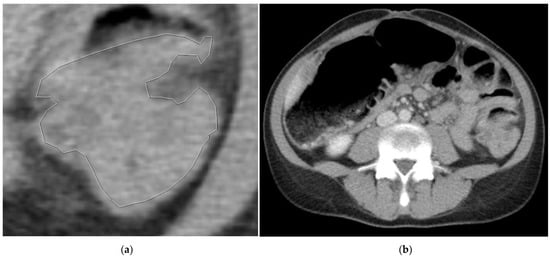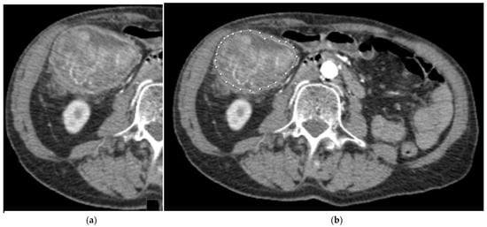 (a) Manually segmented non-mutated KRAS tumor. (b) Abdominal contrast-enhancement CT of the same patient.