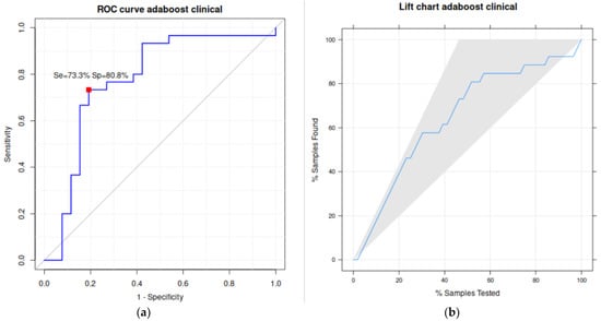 Other performance metrics for the best classification are reported in Table 4. Specifically, AdaBoost achieved high sensitivity (73.3%), specificity (80.8%), and area under the receiver operating curve (ROC); that is, (in %) 77.8%. The sensitivity and specificity of the best model (kappa = 53.7%) were calculated from the upper confusion matrix in Table 3. The left panel of Figure 4 plots this curve, which is quite near the upper left corner that identifies the ideal classification. The red square locates the working point achieved by AdaBoost. The right panel plots the lift curve, where the black line inside the gray shadowed area is also fairly near the left border of this area, identifying the ideal classification.