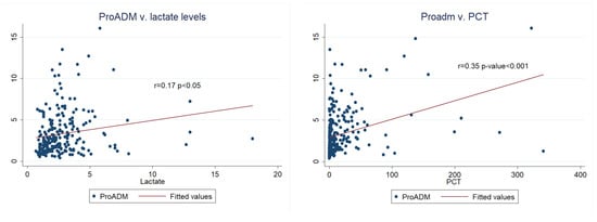 Figure 4. Correlation between MR-proADM and lactate and MR-proADM and PCT.