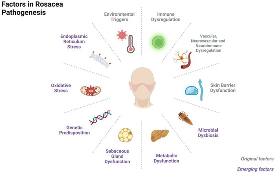 Schematic diagram illustrating the original and emerging factors implicated in the pathogenesis of rosacea. The figure was created with BioRender.com (accessed on 28 June 2023).