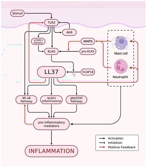 Schematic representation of TLR2/KLK5/LL37 pathway. The red arrows in the figure signify a positive feedback loop, which contributes to the chronicity of the disease. The figure was created with BioRender.com (accessed on 28 June 2023).