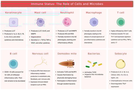 Cells and microbes involved in the immune state of rosacea. The figure was created with BioRender.com (accessed on 28 June 2023).