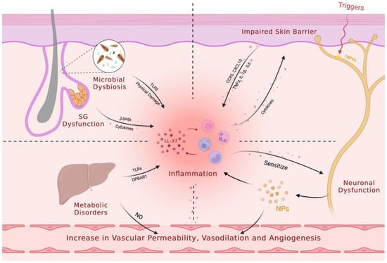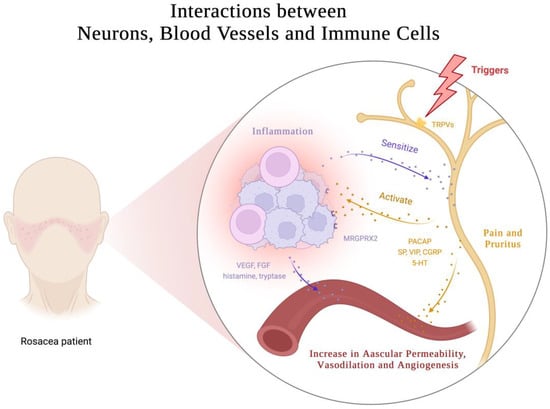 Schematic illustration depicting the intricate interplay among nerves, blood vessels, and immune cells in the development of rosacea. The figure was created with BioRender.com (accessed on 28 June 2023).