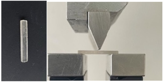 - The three-point bending test was used to conduct the bending resistance test (Figure 2), which measured bending resistance and Young’s modulus. The samples were rectangular prisms with dimensions of 25 mm in length, 2 mm in height, and 2 mm in width. With a force of 50 N/min, the arm was lowered at a pace of 1 mm/min.